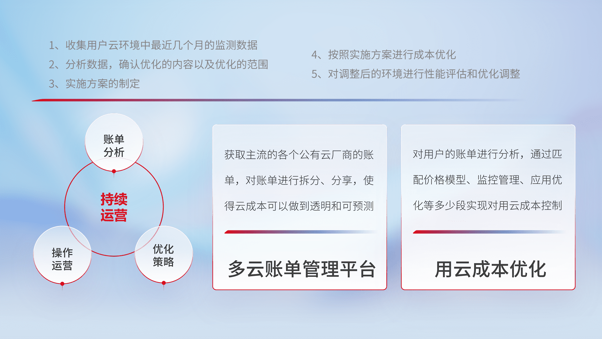 通过多云纳管,,,,以统一的资源数据模型把客户的云资源进行抽象和封装,,,,进而实现对多云资源的统一操作,,,保障云资源管理的可靠性、、、、稳定性与可用性。。量身定制化运维内容,,,,配置、、、开发运维、、、、补丁管理、、、、备份、、监控、、、、认证和访问管理、、、、审计和日常巡检等,,,,保障在用云过程中的可靠度,,稳定度以及高可用率。。。