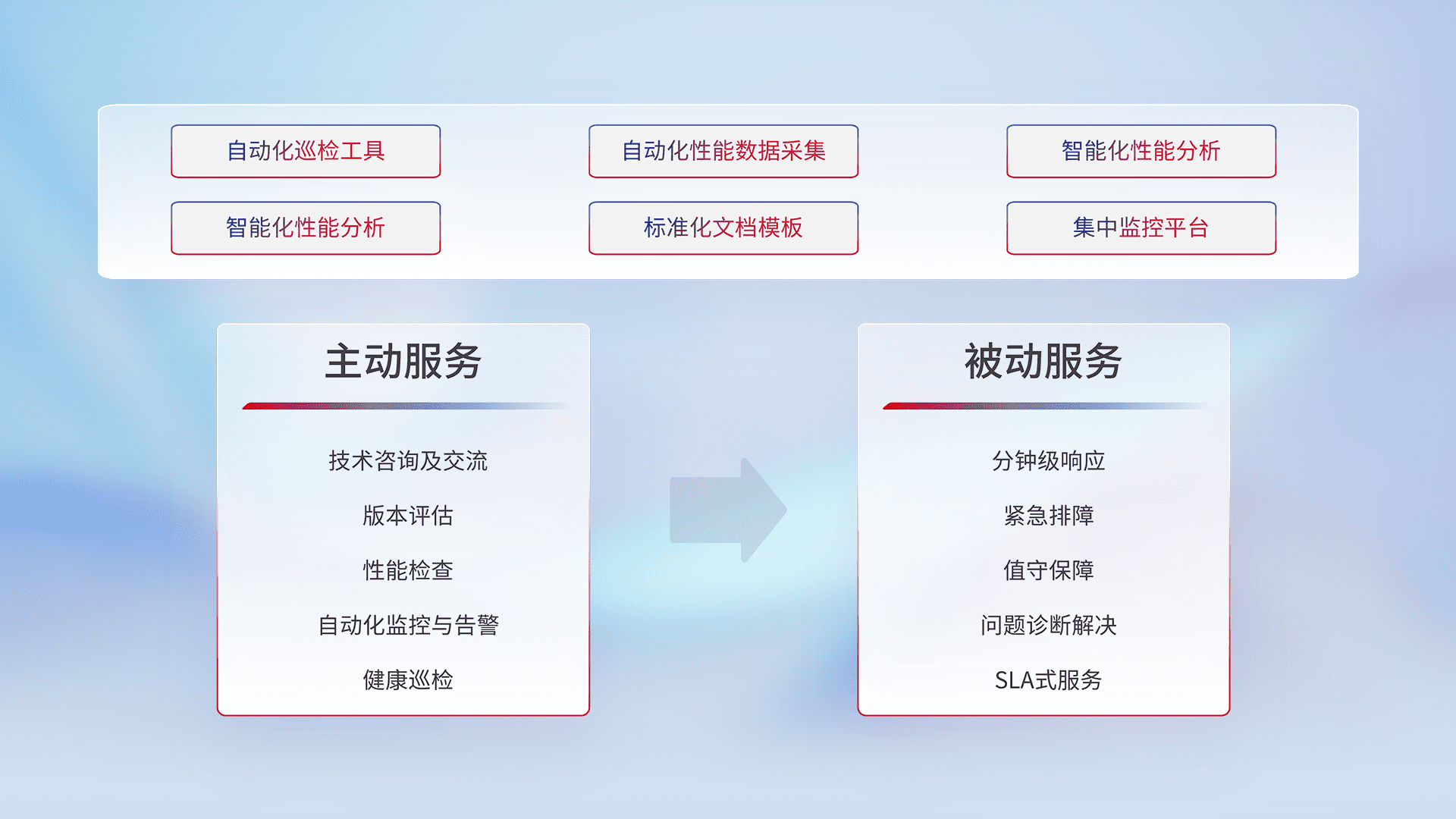 智能化工具和标准化文档,,,,保障服务质量,,,提供主动服务(包含技术咨询、、、版本评估、、性能检查、、、自动化监控与告警、、健康巡检)和被动服务包含(分钟级响应、、、紧急排障、、、、值守保障、、问题诊断解决、、、SLA服务)。。。