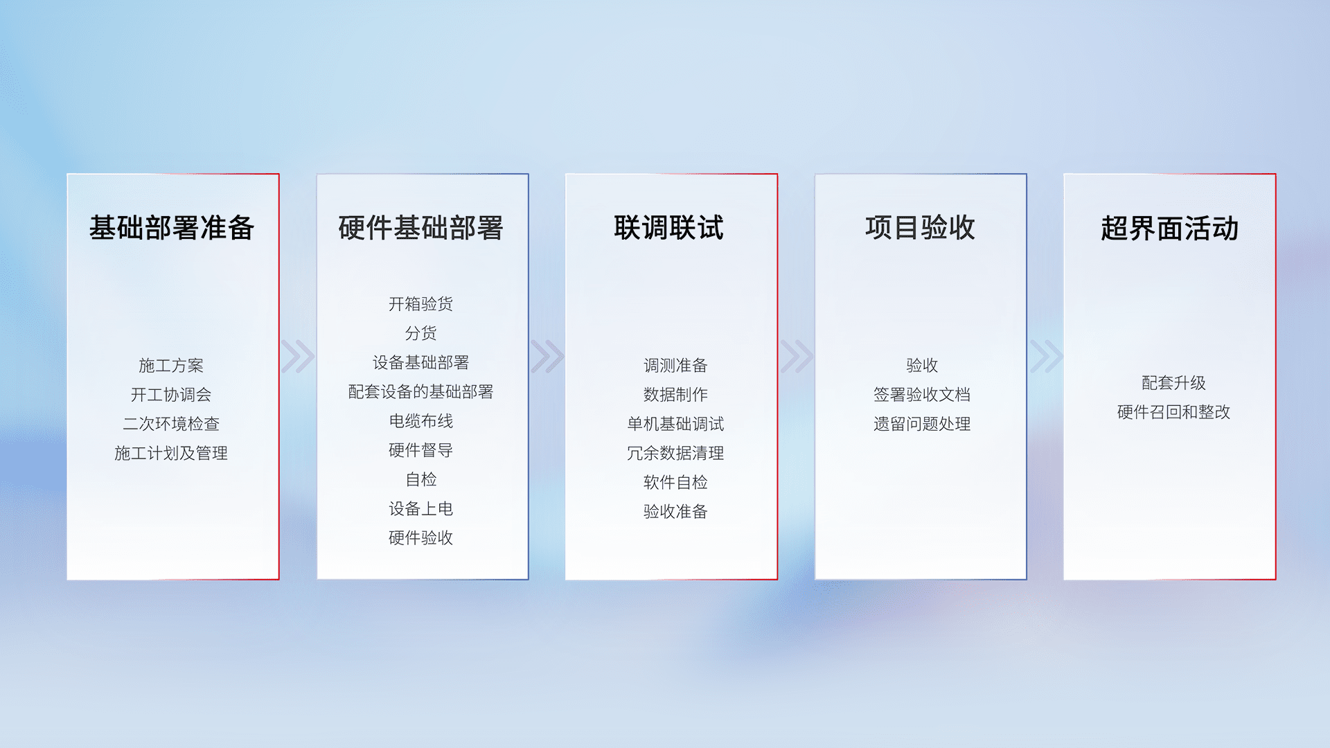 从基础部署准备、、、、硬件基础部署、、、、联调联试、、、项目验收、、、、越界面活动的全过程可追溯,,,,保证施工质量和进度。。。。